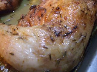 Chicken. I bought chicken legs, which were reasonably priced and reassuringly tinged with yellow and had a notion that I would marinate them in thyme, garlic and lemon then roast them off. The oven, not being furnace like and therefore giving a longer cooking time, would result in the meat coming away easily from the bones. The quality of the chicken meant the end result was tasty, succulent and gorgeous. I made the marinade in the morning and coated the chicken legs with it, rubbing it into the skin and then covering and putting in the fridge, taking it out and turning the meat over when I remembered. Then it was just a case of placing on an oven tray and letting the oven do it's thing. Marginally more effort than opening a tin of hot dogs, but not much.